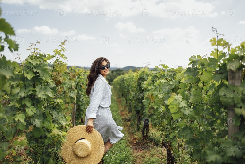 Привлекательная брюнетка в элегантном платье и солнцезащитных очках прогуливается по винограднику