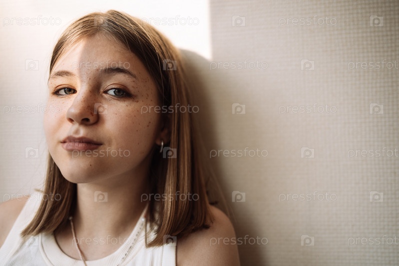 Крупным планом портрет милого подростка у стены. Очаровательная улыбающаяся девушка с солнечным светом на лице
