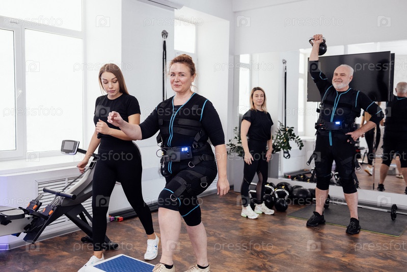 Пожилой мужчина делает упражнения с гирями под руководством личного тренера. Пухлая женщина средних лет занимается на степ-платформе со своим тренером по фитнесу