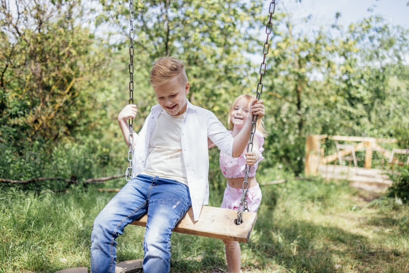 Симпатичная маленькая девочка летом качает брата на качелях