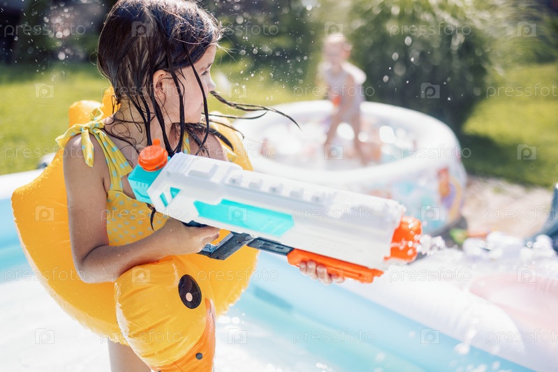Радостная маленькая девочка в купальнике с надувным кругом на террасе. Милые дети бездельничают и брызгают водой