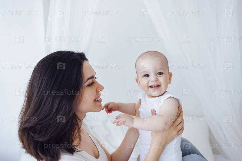Симпатичный младенец в белом боди со своей мамой на светлом фоне. Концепция материнства