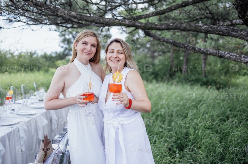 Две молодые женщины обнимаются и держат стаканы с апельсиновым коктейлем на природе. Вечеринка на свежем воздухе. Очаровательные друзья в белых платьях пьют апероль и празднуют на улице