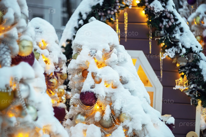 Рождественская елка, украшенная игрушками и гирляндами на улице зимой