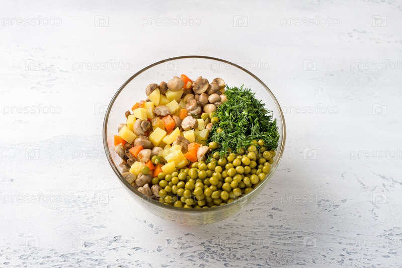 Стеклянная миска с вегетарианским салатом оливье из картофеля, моркови, лука, соленых огурцов, грибов, зеленого горошка и укропа на голубом фоне, вид сверху. этап приготовления