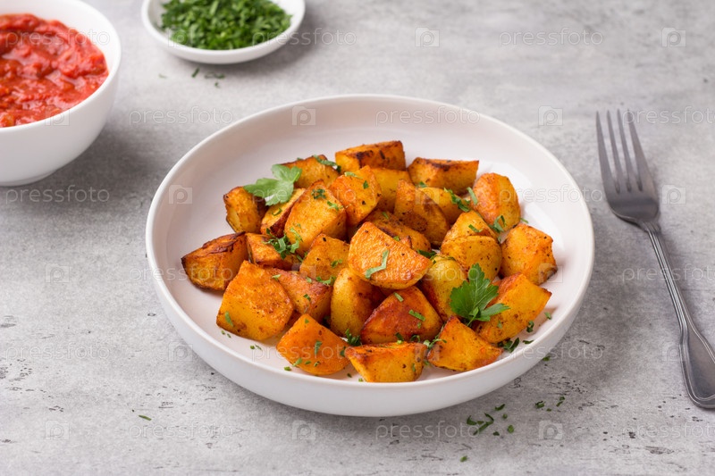 Традиционный испанский картофель, пататас бравас с копченой паприкой, острым томатным соусом и петрушкой в белой миске на фоне серого камня, вид сверху. Вкусная домашняя еда