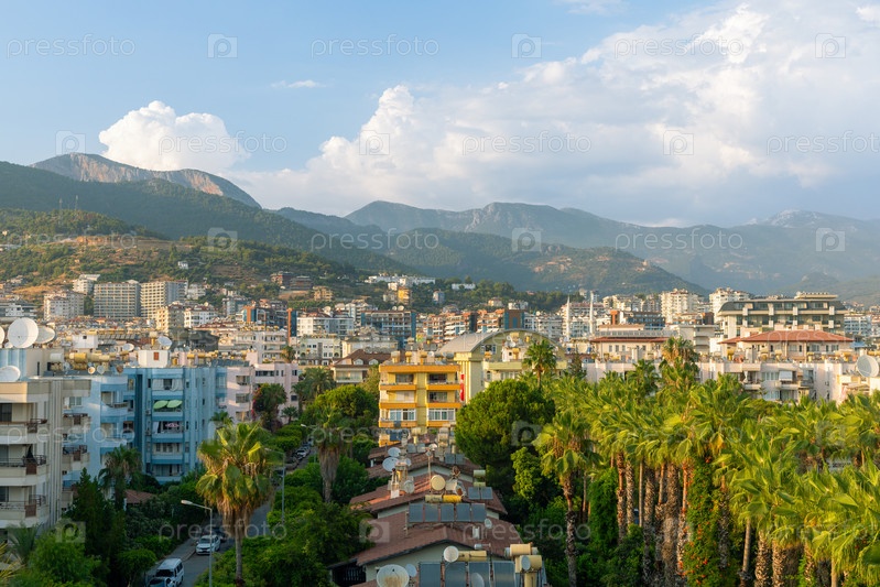 Прекрасный вид на дома, магазины, улицы, отели в турецком курортном городе Алания на фоне гор на рассвете