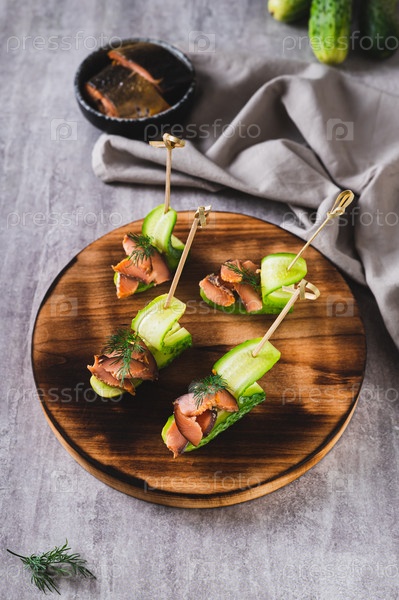 Вкусные канапе из огурца, красной рыбы и укропа на доске на столе, вертикальный вид