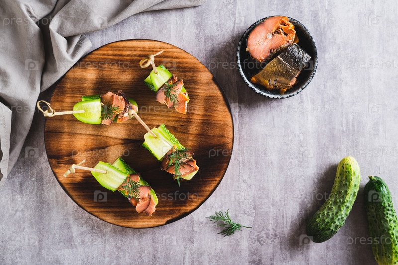 Пикантная закуска из свежих огурцов, копченой красной рыбы на доске на столе