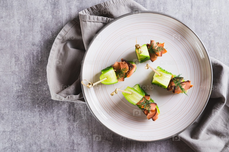 Крупным планом закуска из свежих огурцов, копченая красная рыба на тарелке на столе