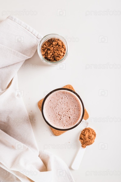 Шоколадный протеиновый энергетический коктейль в стакане на столе и вертикальный вид