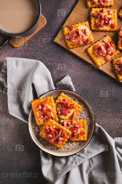 Вкусные крекеры, запеченные с сыром и колбасой на тарелке и доске, вертикальный вид