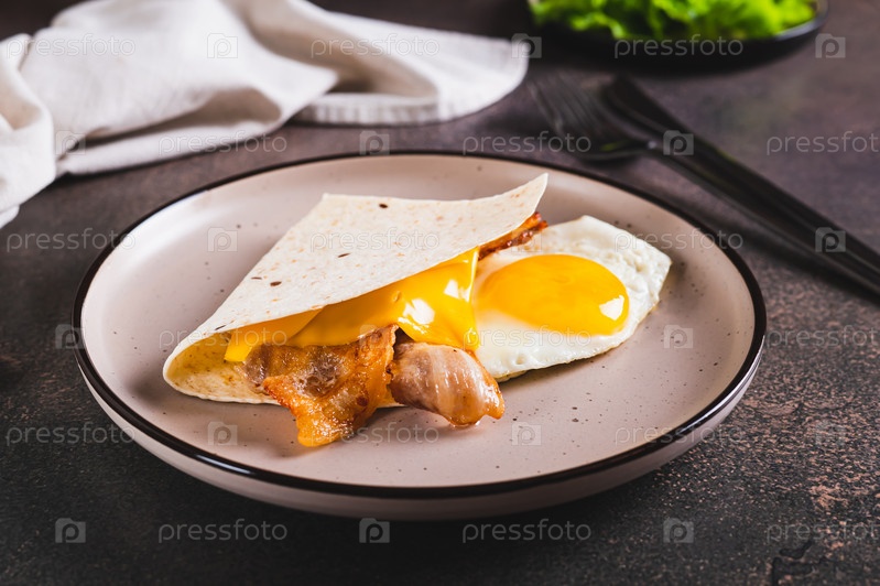 Кесадилья с жареным яйцом, беконом и сыром на тарелке на столе