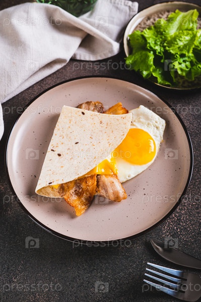 Зерновая лепешка с яйцом, беконом и сыром на тарелке на столе, вертикальный вид