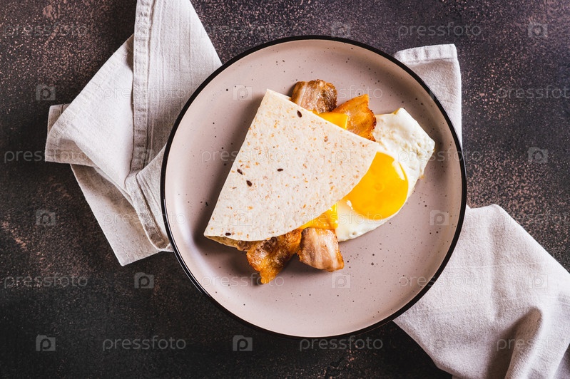 Крупный план кесадильи с жареным яйцом, беконом и сыром на тарелке на столе