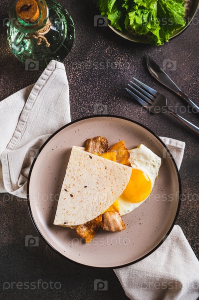 Зерновая лепешка с яйцом, беконом и сыром на тарелке на столе и вертикальный вид