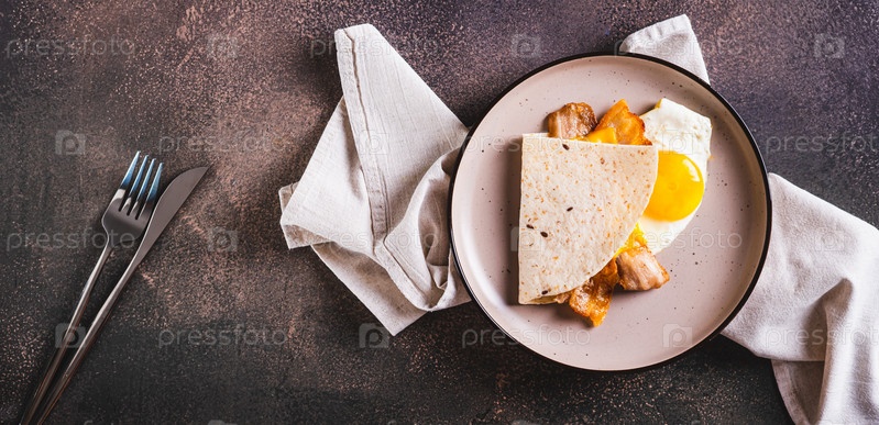 Зерновая лепешка с яйцом, беконом и сыром на тарелке на столе, вид веб-баннера