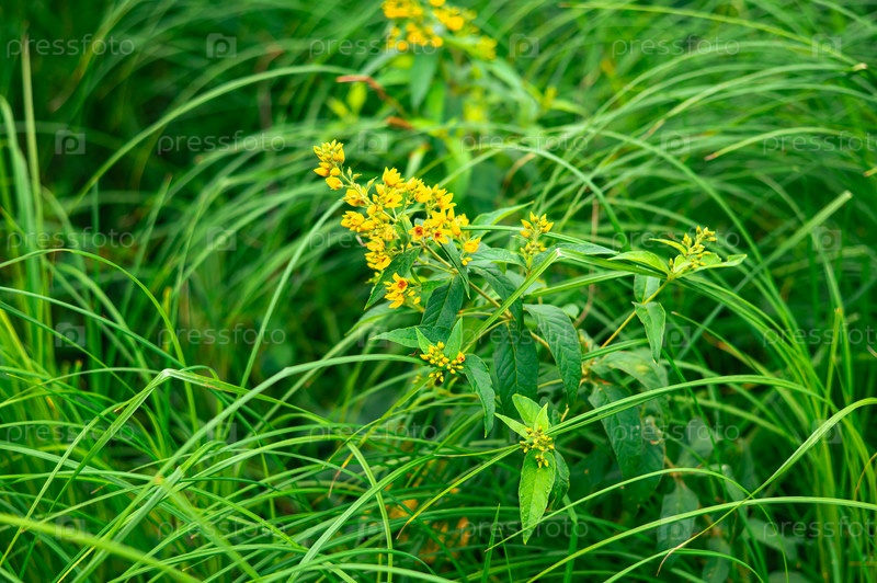 Ветка желтого вербейника среди сочной свежей травы на лугу летом
