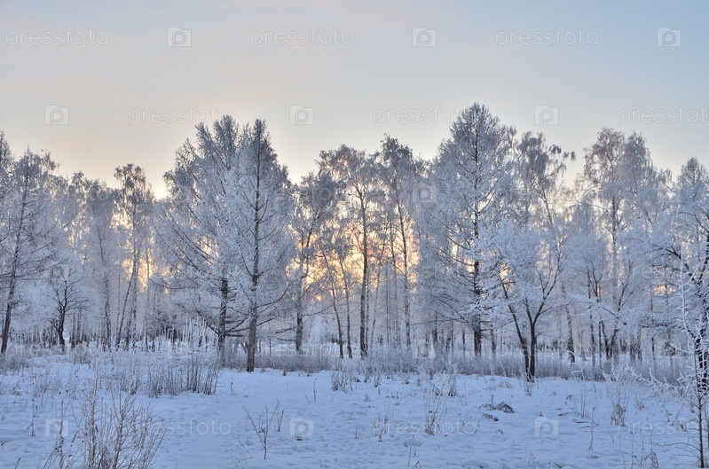 Деревья покрытые инеем в первых лучах солнца