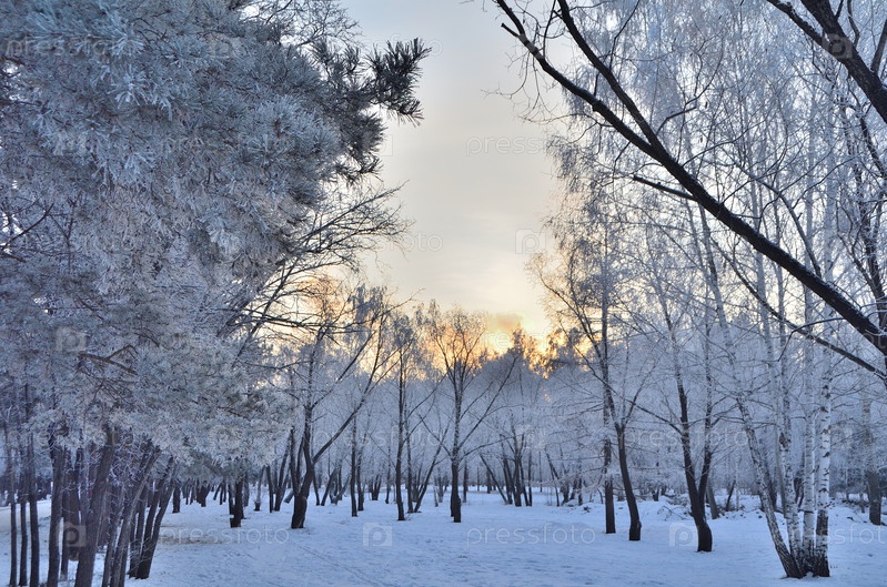 Деревья покрытые инеем в первых лучах солнца