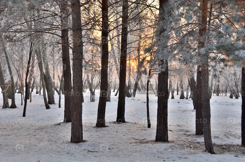 Деревья покрытые инеем в первых лучах солнца