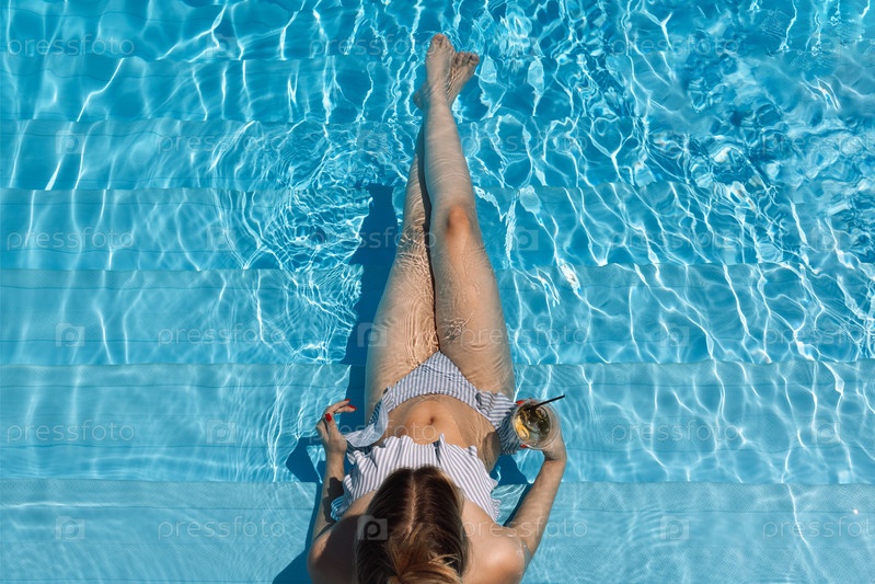 Стройная девушка в купальнике сидит в бассейне и держит коктейль. Вид сверху. Подросток наслаждается отдыхом в отеле