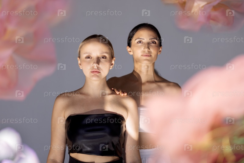 Две молодые разноплановые женщины в топах уверенно смотрят в камеру, позируя вместе на цветочном фоне. Очаровательные модели с естественным макияжем и идеальной кожей