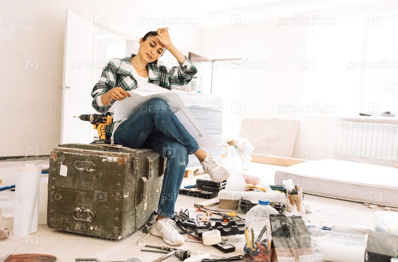 Молодая уставшая женщина с планом дома сидит на коробке среди строительных материалов и инвентаря. Девушка в повседневной одежде думает о ремонте дома