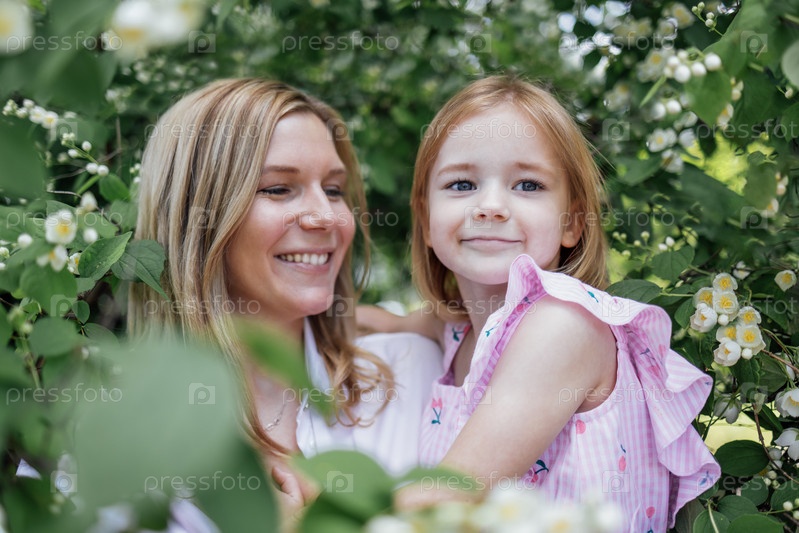Смеющаяся милая маленькая девочка и очаровательная мама вместе в цветах жасмина