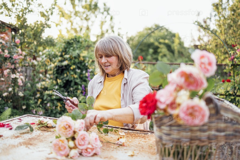 Женщина средних лет сидит за столом и на открытом воздухе собирает букет роз. Зрелая женщина заботится о цветах в саду