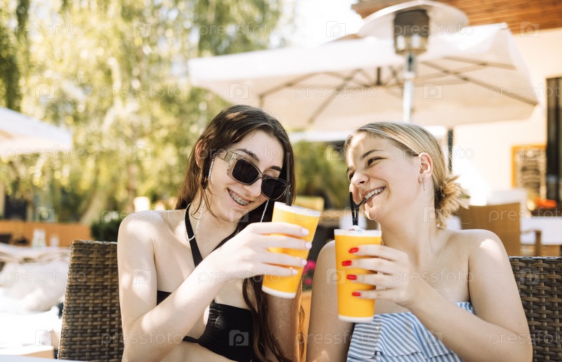Два милых друга в купальниках пьют свежий вкусный сок. Радостные подростки поднимают тост и чокаются лимонадом