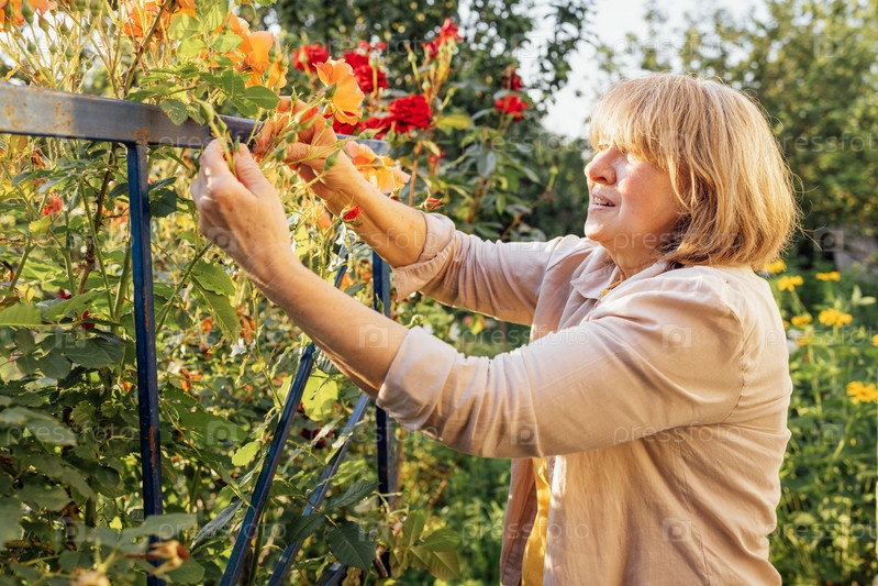 Женщина средних лет срезает в саду розы. Зрелый садовник в повседневной одежде