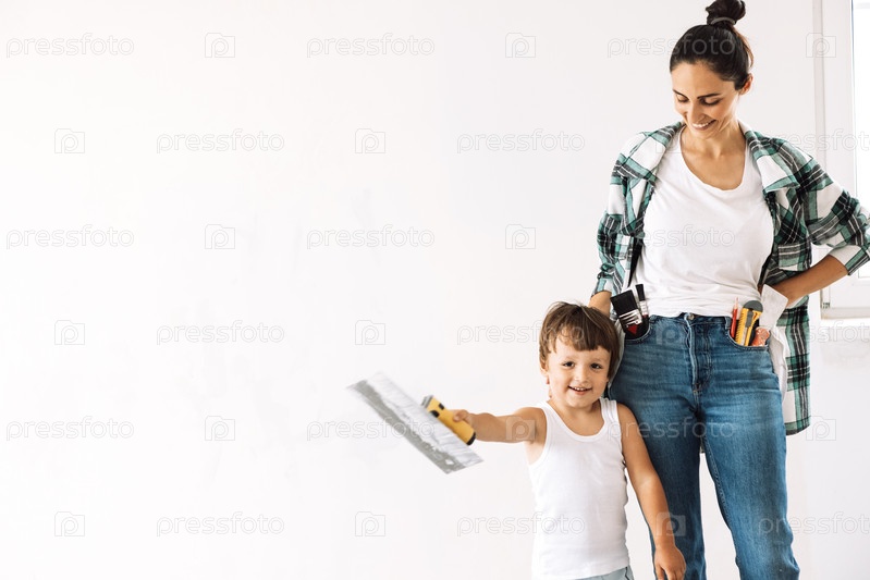 Молодая женщина со строительными инструментами в карманах джинсов и ее милый сын веселятся вместе в отремонтированной комнате. Маленький мальчик с лопаточкой и его улыбающаяся мать на фоне белой стены