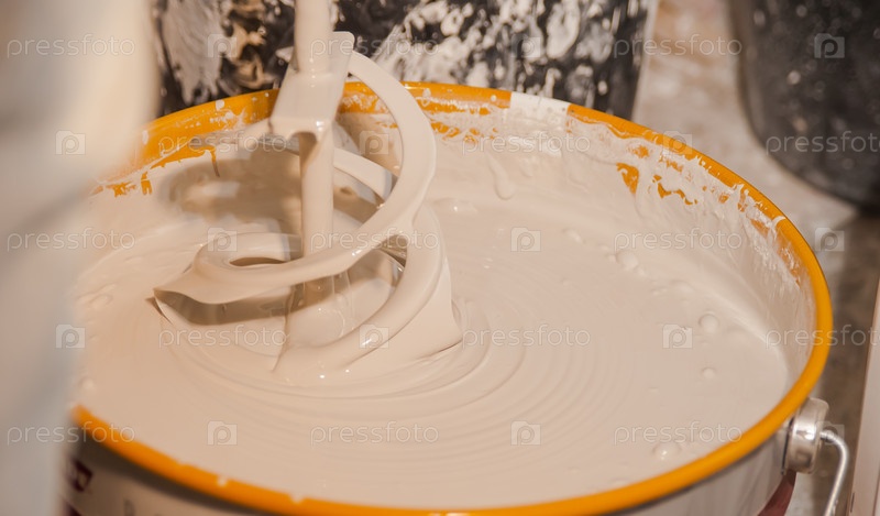 Перемешивание краски в ведре перед покраской