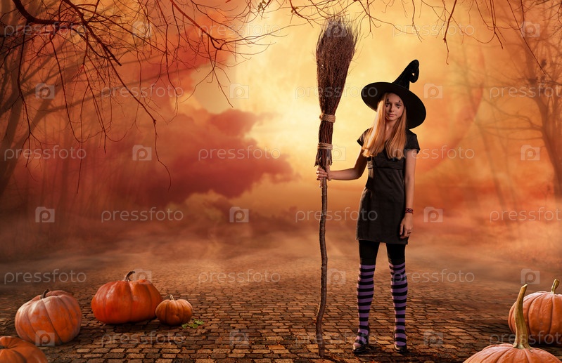 Девочка-подросток в костюме ведьмы стоит с метлой среди тыкв на фоне дыма и луны на булыжной дороге