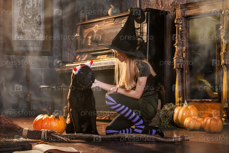 Девочка-подросток в костюме ведьмы и игривая черная собака шарпей сидят рядом с метлой и тыквами, вокруг дым и таинственная атмосфера Хэллоуина