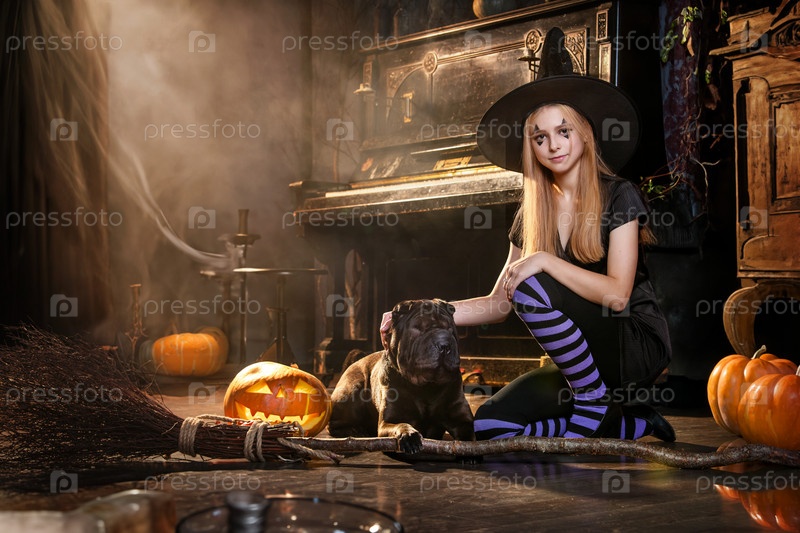 Девочка-подросток в костюме ведьмы и игривая черная собака шарпей сидят рядом с метлой и тыквами, вокруг дым и таинственная атмосфера Хэллоуина