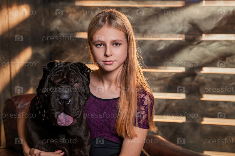 Девочка-подросток в костюме ведьмы и игривая черная собака шарпей сидят рядом с метлой и тыквами, вокруг дым и загадочная атмосфера Хэллоуина