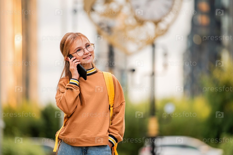 Школьница с рюкзаком идет по улице города и разговаривает по телефону