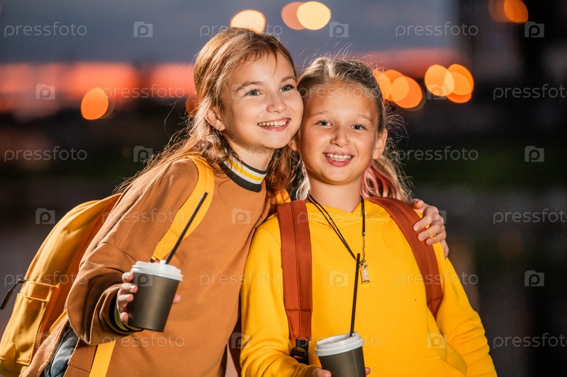 Две очаровательные школьницы гуляют с бумажными стаканчиками и пьют по вечерней городской улице на фоне заката