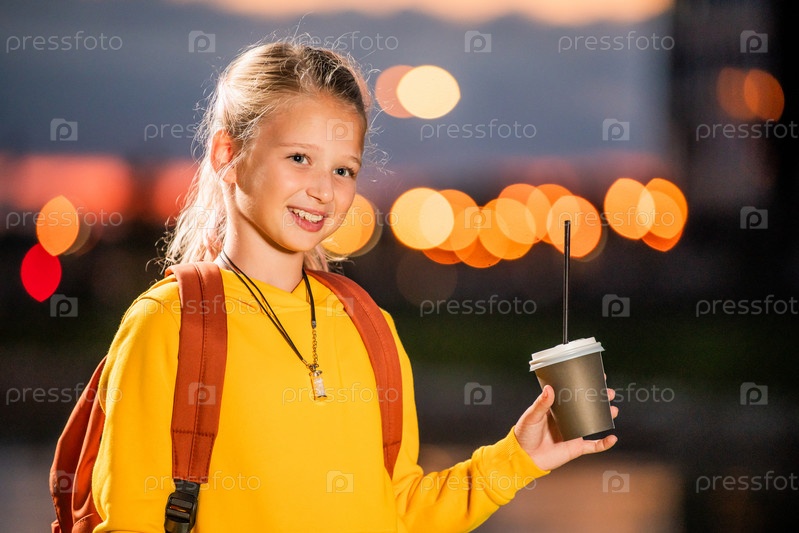Очаровательная школьница гуляет с бумажными стаканчиками и пьет по вечерней городской улице на фоне заката