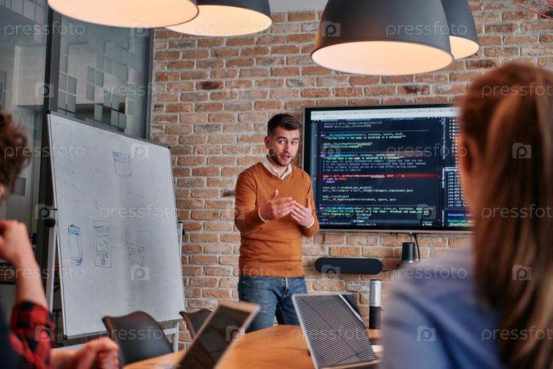 В корпоративной обстановке бизнесмен проводит встречу, страстно представляя бизнес-план своей внимательной команде, способствуя сотрудничеству и стратегическому мышлению