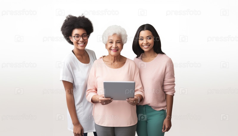 На сером фоне изображена разнообразная группа женщин: одна женщина держит планшет, что символизирует возможность подключения, расширение прав и возможностей и современные технологии в мультикультурной среде. Сгенерированное изображение