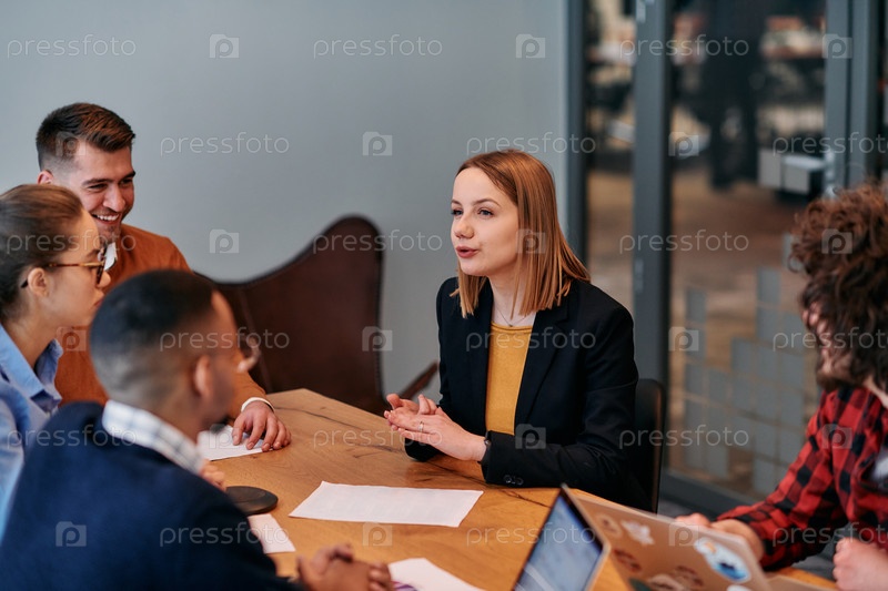 В оживленной атмосфере современного стартап-офиса разнообразная команда бизнес-профессионалов обсуждает различные проекты и разрабатывает новые бизнес-стратегии, олицетворяя креативность и инновации в предпринимательской сфере