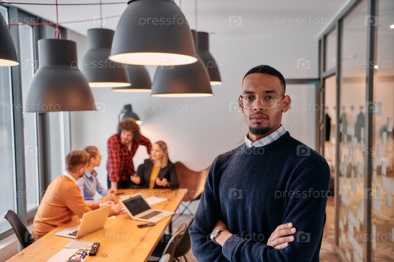 Лидерство стартапа: афроамериканский бизнесмен в современном офисе с коллегами на заднем плане