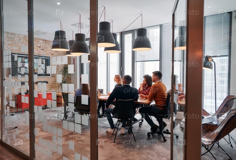 В элегантном стеклянном офисе команда профессионалов бизнеса участвует в оживленных дискуссиях и обменивается стратегическими идеями, демонстрируя сотрудничество и инновации, лежащие в основе современной корпоративной культуры