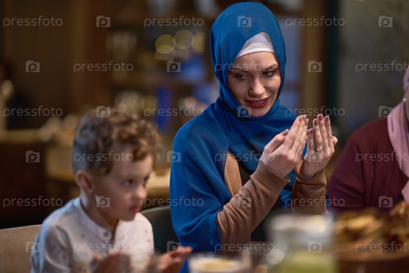В современном ресторане европейская исламская семья собирается вместе на ифтар во время Рамадана, молясь перед едой, объединяя традиции и современные практики в праздник веры и семьи