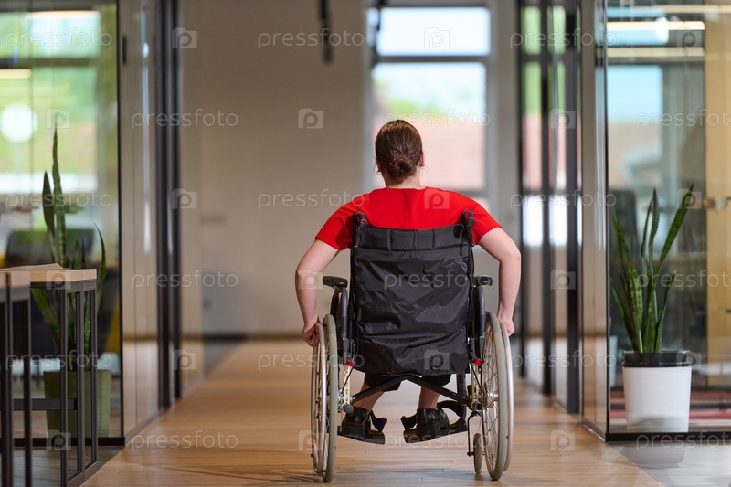 Современная молодая деловая женщина в инвалидной коляске окружена инклюзивным рабочим пространством со стеклянными стенами офисов, олицетворяющим решимость и новаторство в деловом мире