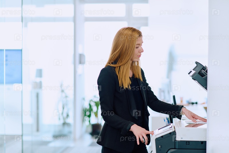 Блондинка-бизнесмен, использующая принтер в офисе