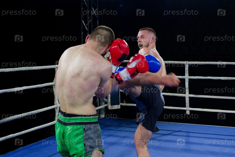 Соперники по кикбоксингу наносят мощные удары ногами в захватывающем поединке